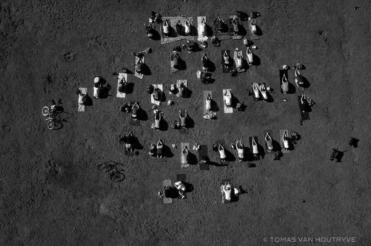 Anche le immagini di Tomas van Houtryve, artista-fotografo che lavora al crocevia tra documentario, attivismo, sperimentazione visiva e riflessione politica, raccontano temi spesso trascurati o invisibili come confini, memoria, sorveglianza, relazione tra individuo e Stato, i modi in cui la guerra e il potere si insinuano nella vita quotidiana. Per la serie Blue Sky Days, parte dall’allarme lanciato da vittime civili di strike con droni — ad esempio dopo un attacco che nel 2012 uccise una donna in Pakistan — e decide di usare un drone per fotografare gli Stati Uniti dall’alto, cercando gli stessi tipi di assembramenti che diventano obiettivi all’estero (matrimoni, funerali, gruppi religiosi, esercizi, ma anche prigioni, feed-lot, zone sensibili). È una serie che mostra un’umanità vista dall’alto: il potenziale inquietante, in questo caso, è che dal cielo possono osservare te, essere comune, come tu, operatore di droni, puoi osservare gli altri. Le immagini rivelano la facilità con cui la sorveglianza aerea può penetrare la vita quotidiana, rendendo visibile — e vulnerabile — ciò che credevamo privato. La serie evidenzia come il drone-eye view non sia solo tecnica o estetica ma, soprattutto, politica perché pone domande su privacy, potere e normalizzazione della sorveglianza: quando perde empatia, ogni attività umana diventa sempre più assurda e pericolosa. Anche la pratica artistica di Tomas van Houtryve ridefinisce la funzione del drone: non come arma, non come strumento militare, ma come «occhio» che documenta, che rende visibile e che espone — proprio l’inverso della logica di invisibilità tipica dei droni bellici. Il progetto Blue Sky Days è un contrappunto estetico e morale alla visione tecnologica-militare del drone. Molti suoi lavori — quelli sui regimi comunisti, quelli sulla frontiera USA, quelli sulla guerra invisibile — mostrano come immagini, spazio, sorveglianza e potere siano intrecciati e come la fotografia possa rivelare strutture che sfuggono a uno sguardo ordinario.