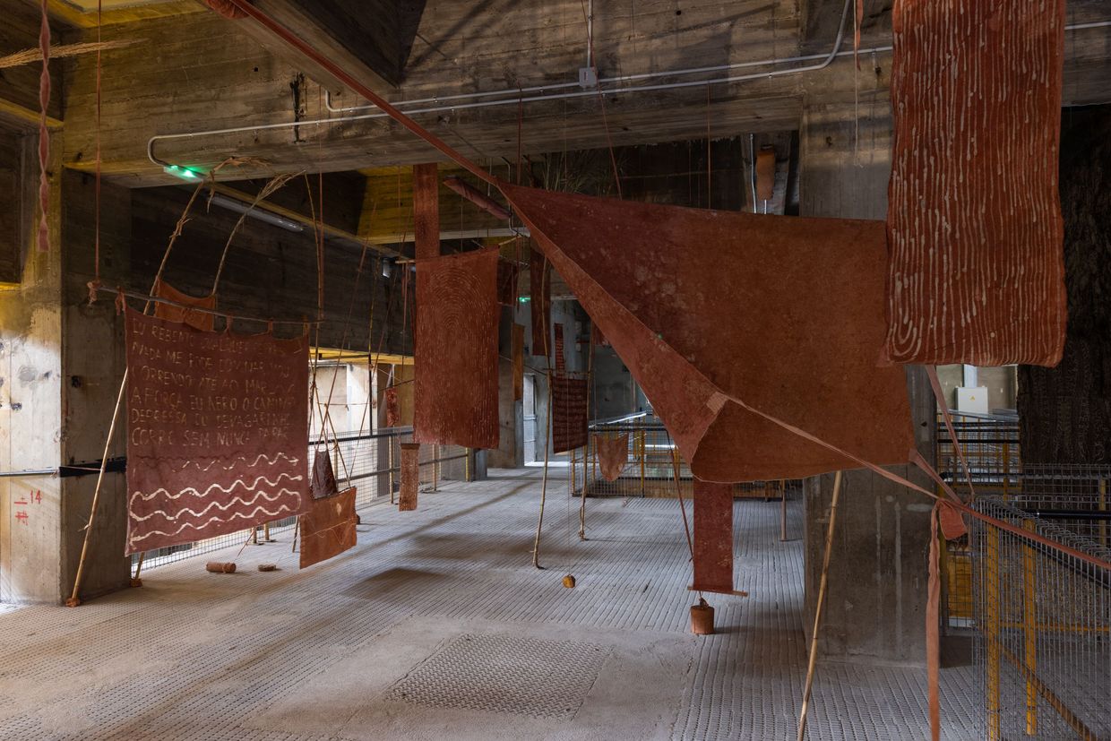 L’interno, con una sua complessità architettonica, stratificata in piani congiunti a scale e piloni di cemento, ospita, oltre a Claire Fontaine, altri venti artisti in dialogo con lo spazio: è allora appropriato il film di Dziga Vertov, The Eleventh Year, il primo di una trilogia che celebra la modernità dell’Unione Sovietica e che documenta la costruzione della centrale idroelettrica di Dnipro, distrutta durante la Seconda Guerra Mondiale e ricostruita in seguito. Così come le Tres Xemeneies, la centrale fu per il popolo ucraino l’inganno di un sogno politico, economico e sociale.