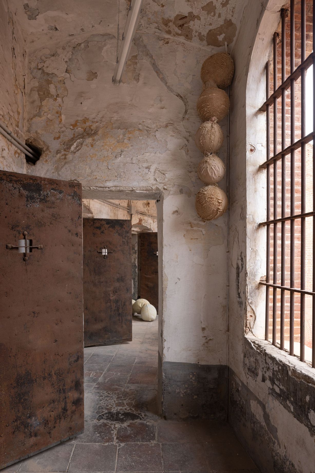 Il carcere di Matarò, segnato dal tempo e dai fantasmi dei suoi abitanti, è disseminato di corpi flaccidi, opera dell’artista catalana Eva Fabregas. Sono palloncini in latex pieni d’aria, ricoperti di resina e trattati come innesti architettonici: promiscue cellule-uovo posizionate tra corridoi, stanze e anticamere e lasciate al loro destino, sculture che invitano a rileggere l’architettura delle stanze come un unico spazio cresciuto organicamente. Sono oggetti morbidi e corporei, ludici e odorosi, corpi caratteristici del lavoro di quest’artista, che penetrano e si diffondono dai lati, dal soffitto e attraverso le travi e le finestre, e abitano un ambiente organico-tecnico. I confini tra i mondi generati tecnicamente, umani e non umani, si confondono. Nelle sue sculture l’aria diventa materia tangibile che crea volumi e forme capaci di cambiare la nostra percezione dello spazio. Sono volumi biomorfi di una morbida tavolozza di colori pastello che si aggrovigliano l’uno con l’altro, alludendo a processi e ritmi biologici legati alla digestione, all’incubazione e alla metamorfosi: un entrare dentro se stessi. Guardarle scatena una duplicità di emozioni: minacciose o stimolanti, innocenti o perverse. Sono accumuli, a tratti in scala monumentale, di sculture gonfiabili, che rappresentano una crescita organica incontrollabile, un intreccio simbiotico tra corpi, forme, materiali e colori che provengono dai mondi fantastici delle storie per bambini e della fantascienza. Come si fa a non amarli.