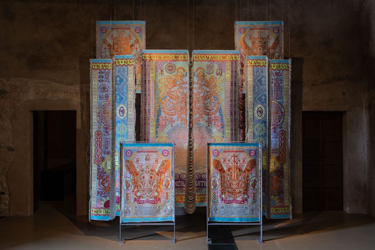 Nel bellissimo complesso religioso di Égara, a Terrassa, mi incanta il gruppo scultoreo in sapone verde della sudafricana Buhlebezwe Siwani, magistralmente inserito nel contesto spirituale del tempio funerario di San Miquel. Nel museo vicino, è molto appropriato il dialogo fra la pala d’altare di Lluís Borrasá, maestro della pittura gotica catalana, e il contemporaneo arazzo in tessuto del malese Marcos Kueh, artista tessile con un background in graphic design e pubblicità. La sua identità malese e il posto che quest’ultima ha nei discorsi occidentali ha influenzato il suo lavoro: incorpora le leggende contemporanee del suo paese direttamente nei tessuti proprio come i suoi antenati del Borneo facevano con i loro sogni e leggende, prima dell’arrivo dall’Occidente degli alfabeti scritti. Molti dei suoi progetti esplorano la percezione che l’Occidente ha del suo paese, dalle descrizioni coloniali nei musei antropologici di tutto il mondo ai testi di marketing nelle pubblicità turistiche; un confronto continuo tra queste rappresentazioni e le sue esperienze quotidiane in una piccola città del Borneo.