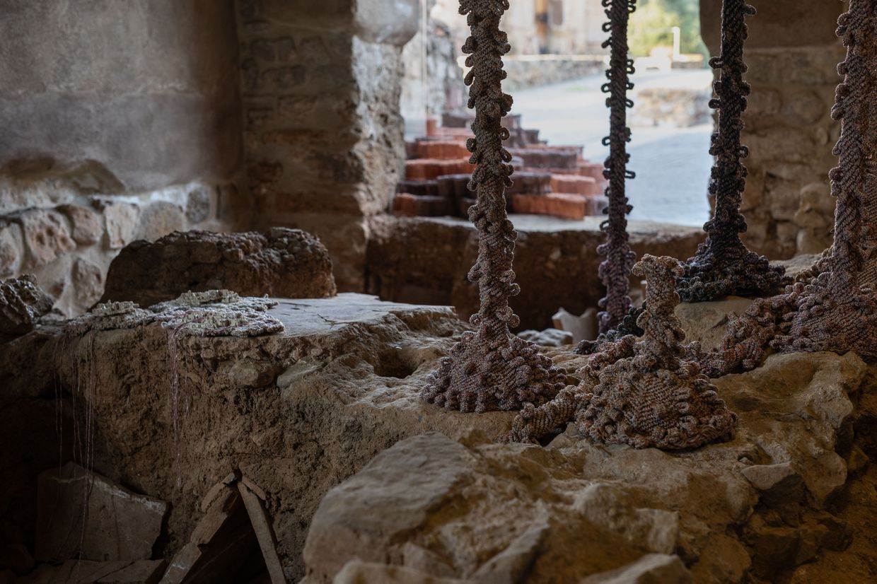 L’olandese Tanja Smeets, con le sue forme organiche che invadono lo spazio, la trovo in due sedi: a Egara e a Sabadell. È un meticoloso lavoro di crescita o espansione naturale il suo articolato processo, che esplora il confine tra arte e l’architettura ed è fatto con materiali comuni e industriali – plastica, fil di ferro, tubi, fili, feltro e altri oggetti d’uso quotidiano – assemblati in strutture complesse. Uno degli aspetti centrali del lavoro di questa artista è l’interazione tra i corpi, compreso quello umano, e lo spazio circostante. Le sue sculture, spesso composte da moduli ripetitivi, sembrano crescere e fondersi spontaneamente sugli edifici o nelle stanze; sono strutture che evocano la natura, i riferimenti sono a organismi, funghi, piante e forme cellulari, e ti invitano a immergere lo sguardo e interagire con loro. Un percorso artistico affascinante che è anche una riflessione sulla relazione tra natura e cultura, tra crescita naturale e artificiale, e tra ordine e caos. A Vapor Buxeda Vell, a Sabadell, antica fabbrica tessile che funzionava a vapore, mimetizza le sue infiorescenze artificiali, fatte di materiali industriali di scarto (plastica, feltro o tessuto), tra caldaie e macchinari tessili.